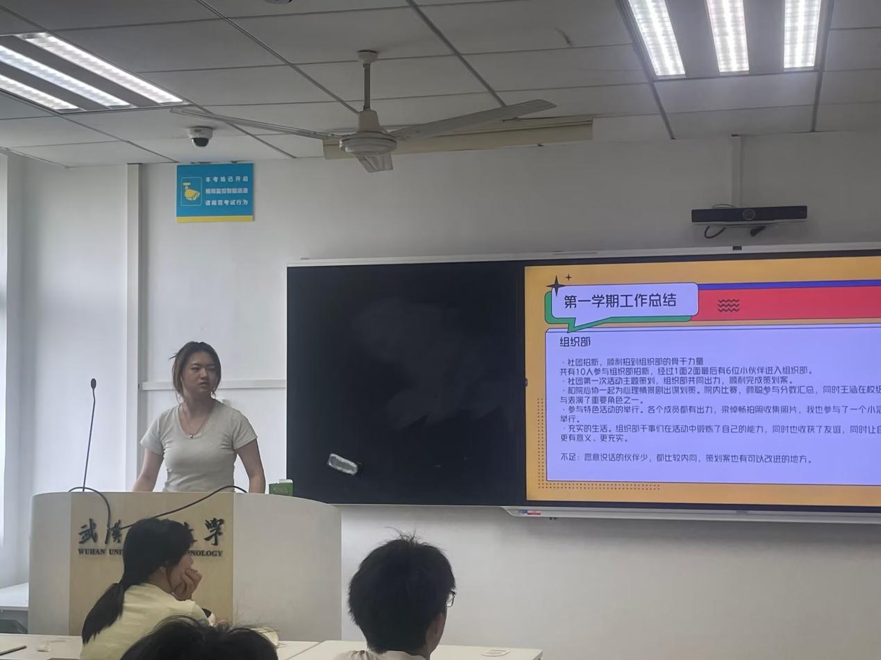 在部门述职环节,三位部长依次作专题汇报。组织部赵子旭首先就上学期工作进行了总结,指出部门在社团活动策划及心理情景剧推进中发挥了积极作用,但存在成员交流机制不畅、活动预案精细化程度不足等问题,本学期将通过定期团建、策划案互评等方式针对性改进。宣传部陈璐瑶重点汇报了新闻宣传矩阵建设成果,上学期累计撰写新闻稿件5篇,设计主题海报3幅,组织专项写作培训2场,后续将着力提升新媒体传播效能。办公室方广博详细介绍了财务报账的优化情况,通过制定报销流程图解手册、建立电子台账系统等举措,实现经费管理规范化、透明化。