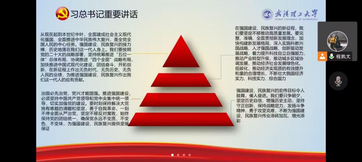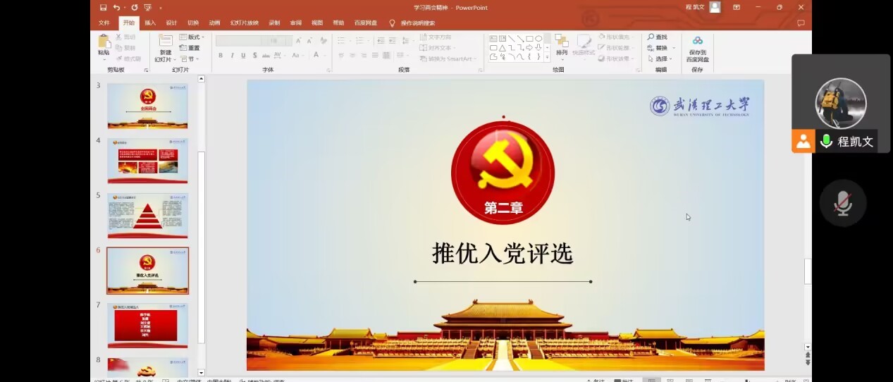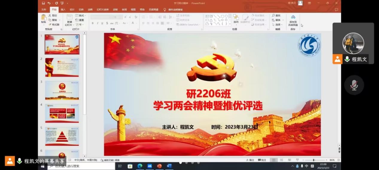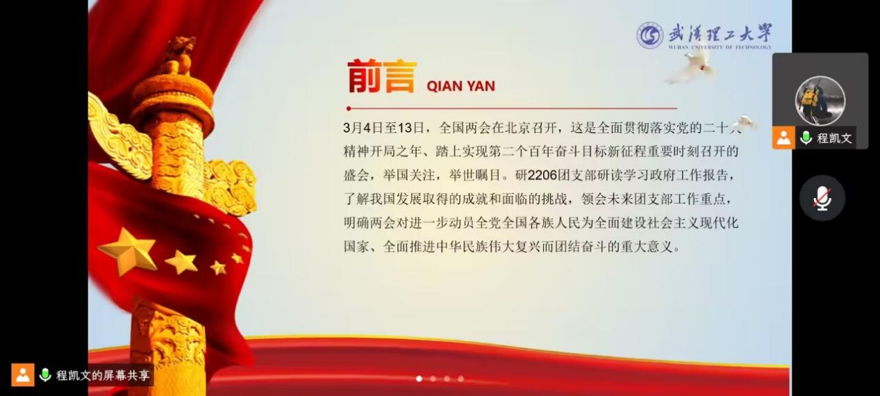 3月22日晚上10时,研2206团支部于腾讯会议召开学习两会精神暨推优评定的主题团日活动。本次主题团日旨在深入学习贯彻党的两会精神,夯实团支部工作基础,提升团支部活力。本次活动由团支书程凯文主持,研2206团支部全体成员参加。