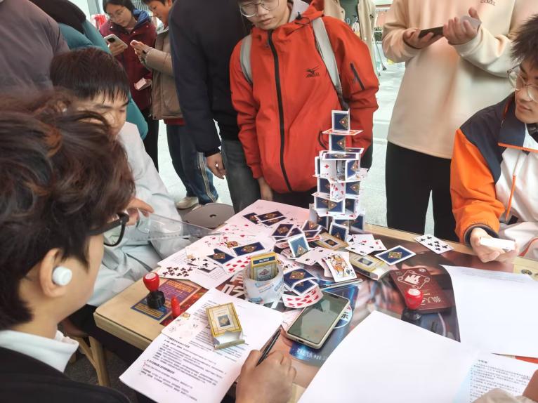活动伊始,同学们有序签到并领取活动卡片,正式开启趣味之旅。在“扑克牌立高挑战”环节,同学们在1分钟内用扑克牌搭建高塔,不仅比拼高度,更要经受桌面振动的稳定性考验,将课堂所学的力学知识巧妙运用到实践中,充分展现了土建学子的动手能力与创新思维。“敲冰救企鹅·新建版”环节则将新型建筑知识融入桌游,同学们可选择单独挑战、组队对战或合作闯关,在敲冰答题的过程中巩固现代建筑知识点,在协作与竞技中收获知识与快乐。
