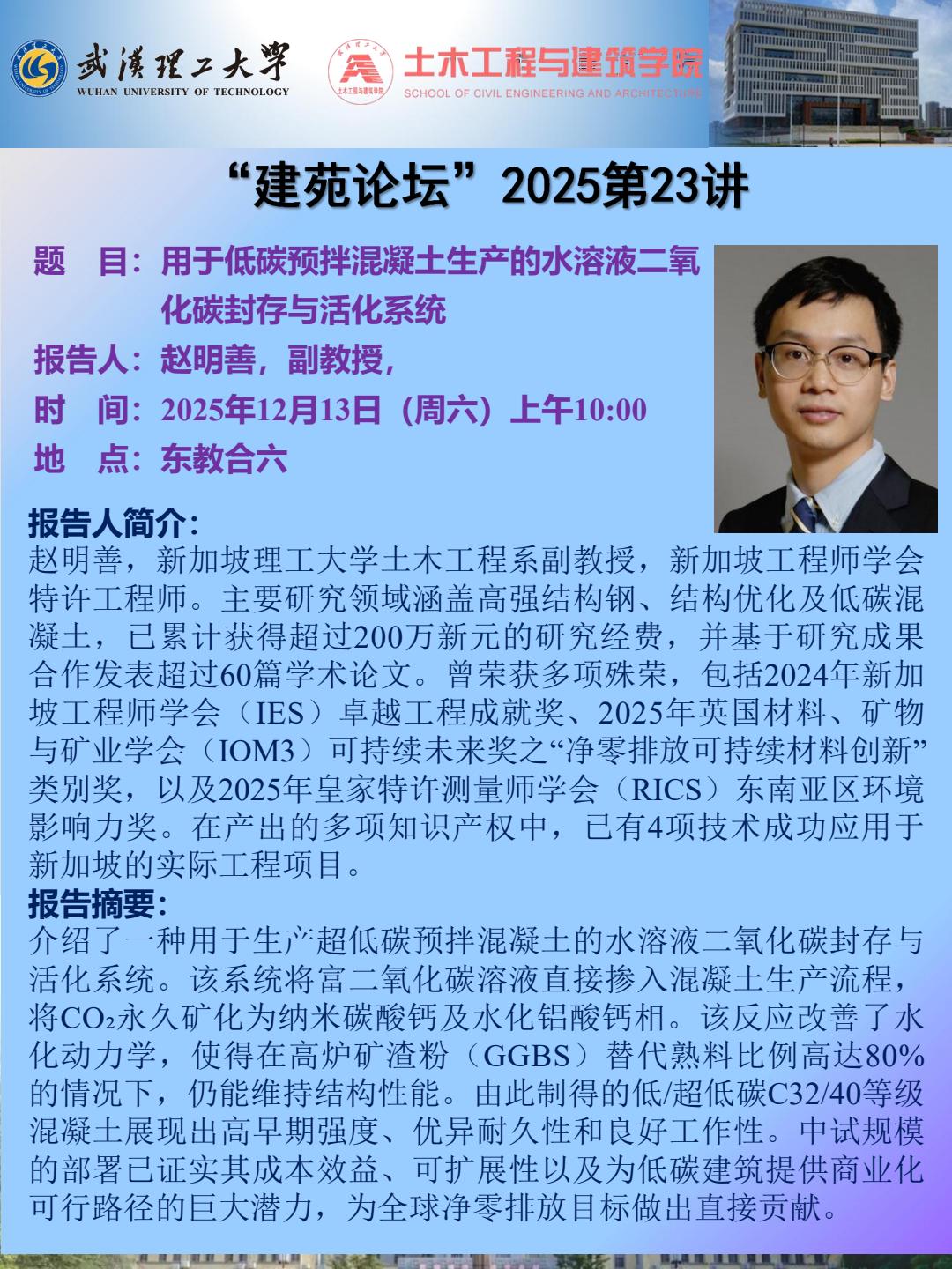 “建院论坛”2025 第23讲 主题:用于低碳预拌混凝土生产的水溶液二氧化碳封存与活化系统