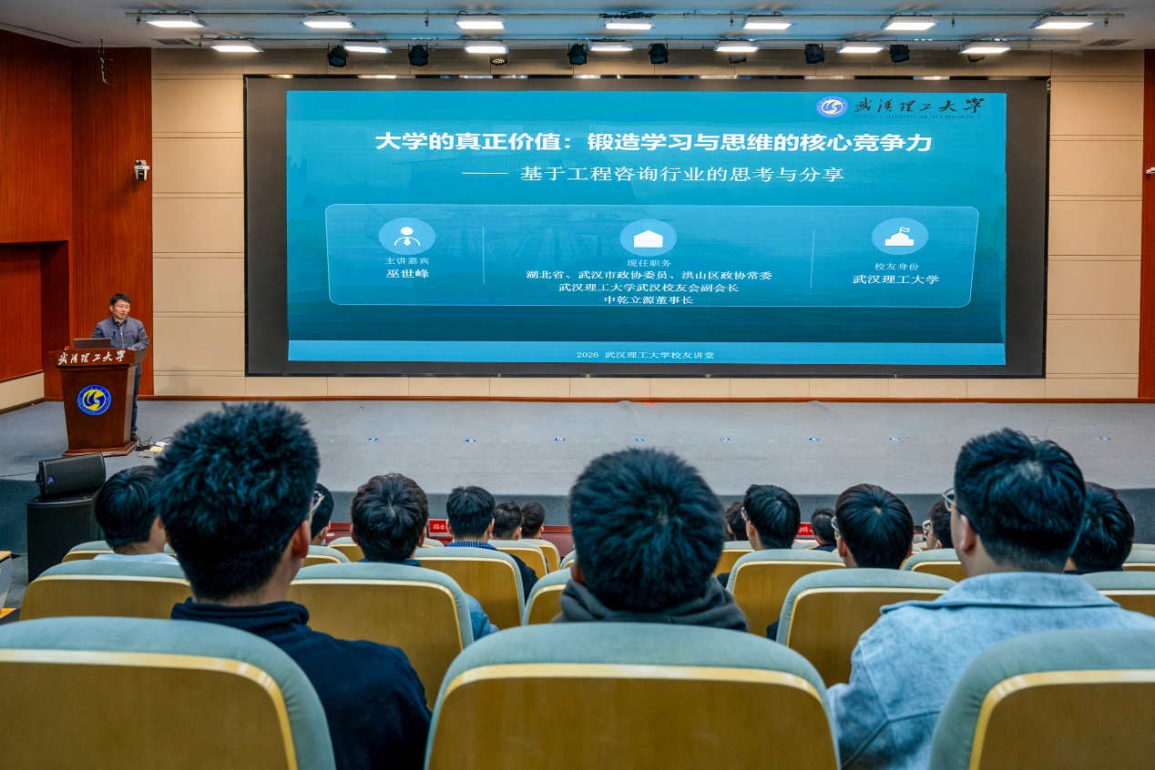 3月26日,中乾立源工程咨询有限公司董事长、湖北省政协委员巫世峰受邀来校,为土建学院2025级本科生作“大学的真正价值:锻造学习与思维的核心竞争力”专题报告。中乾立源总裁梁富运、总经理夏丽波、办公室主任闵芳,土建学院副院长陈伟、党委副书记张巍,及200名2025级本科生参加报告会。报告会由土建学院副院长彭恺主持。